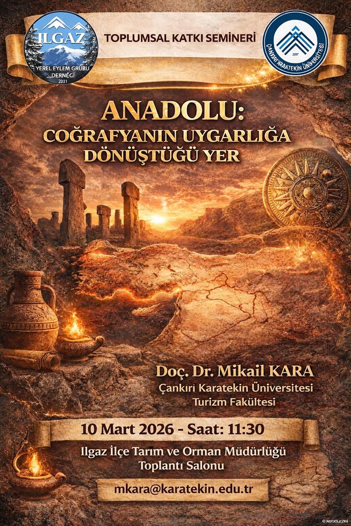 Fakültemiz Turizm Rehberliği Bölümü öğretim Üyesi Doç. Dr. Mikail KARA, toplumsal katkı kapsamında 10.03.2026 tarihinde saat 11.00’da Ilgaz Yerel Eylem Grubu Derneği’nde "Anadolu: Coğrafyanın Uygarlığa Dönüştüğü Yer" başlıklı bir seminer sunumu gerçekleştirilecektir.
